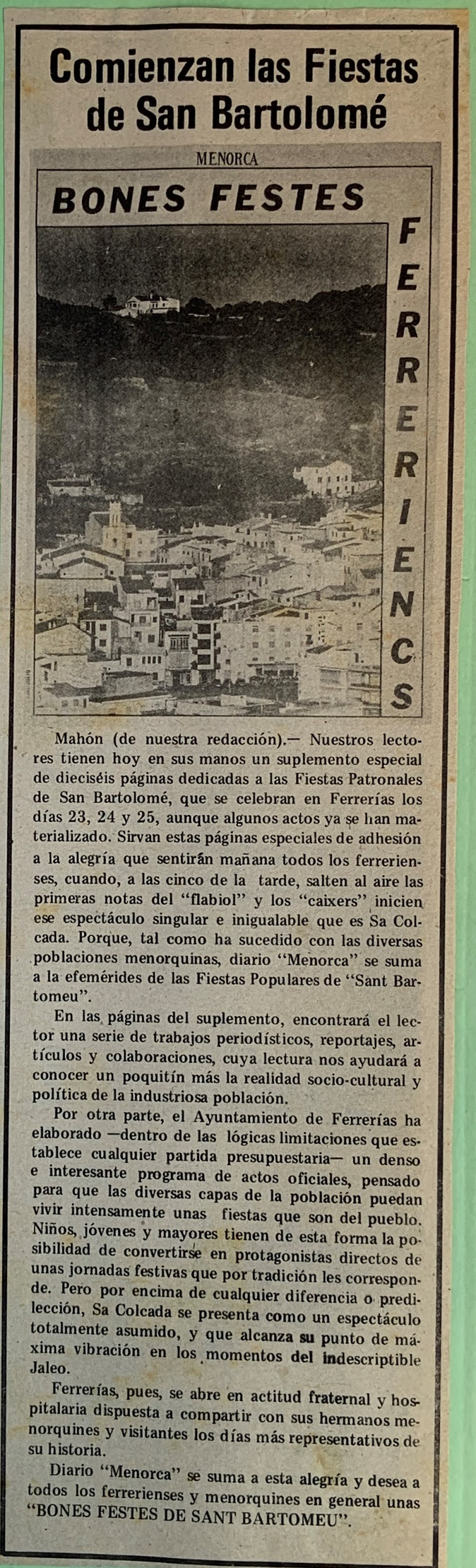 Actes de les festes de Sant Bartomeu: Vetllada Folklòrica, posada en marxa del rellotge, especial Festes de Ferreries del Menorca, Jaleos el dia dilluns, d’agost 18, 1980 Obtén l'enllaç Facebook X Pinterest Correu electrònic Altres aplicacions