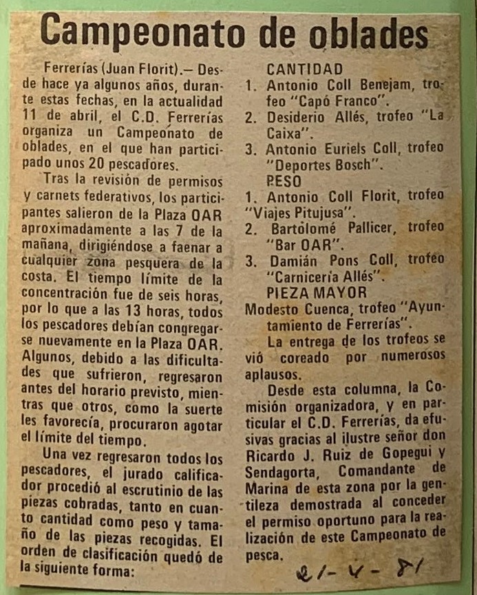 Campionat de pesca d'oblades el dia dimarts, d’abril 21, 1981 Obtén l'enllaç Facebook X Pinterest Correu electrònic Altres aplicacions