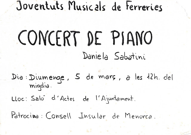 Concert de piano. Daniela Sabatini el dia diumenge, de març 05, 1989 Obtén l'enllaç Facebook X Pinterest Correu electrònic Altres aplicacions